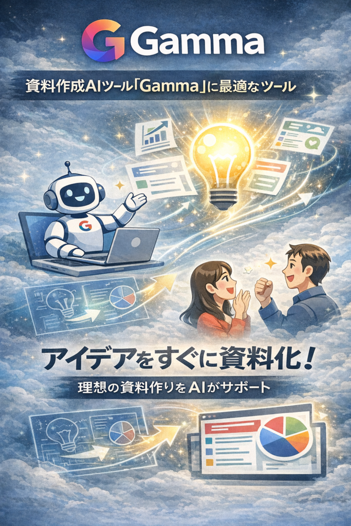 2026年に話題となっているAIツールのひとつが、資料・スライド・ドキュメントの自動生成を得意とする「Gamma(ガンマ)」です。本ツールはAIに短い指示文(プロンプト)を与えるだけで、スライド構成からデザインまで自動生成してくれる革新的なツール。手動でレイアウトを考えたり、細かい装飾をする必要がなく、効率的に見栄えの良い資料を作成できます。