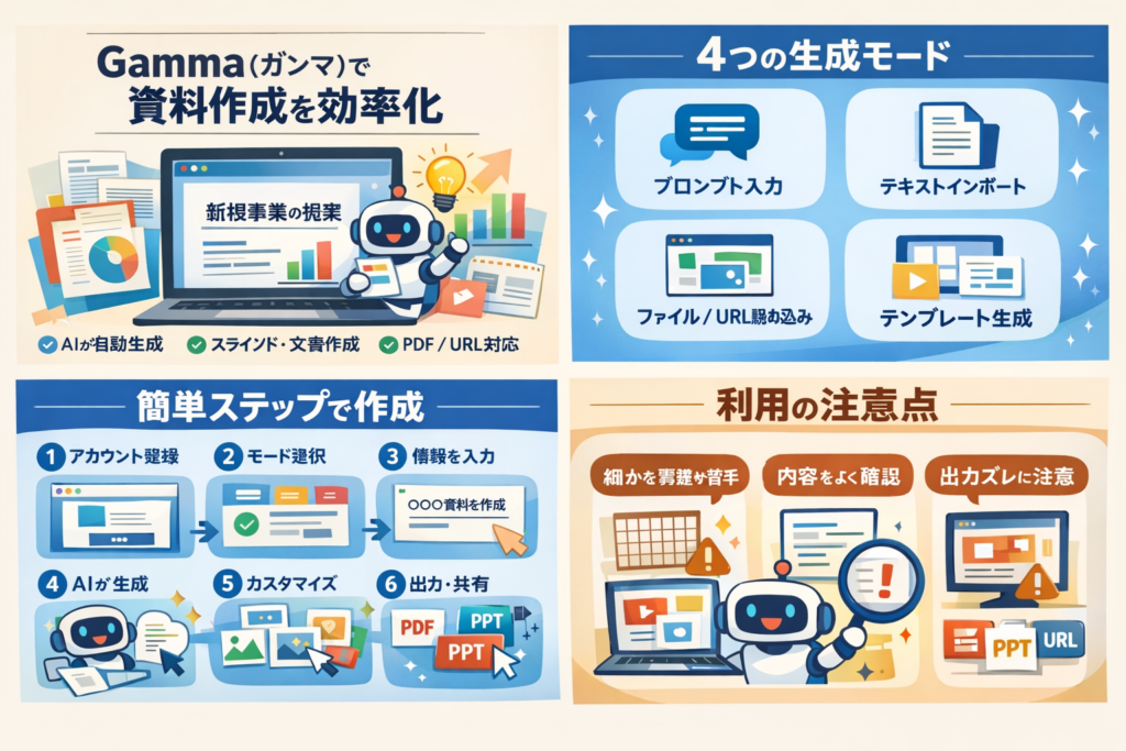 Gammaは、最初の資料作成のハードルを大きく下げるツールです。ゼロから構成を考えたりタイプしたりする手間を省き、AIが形にしてくれるので「資料作成が苦手」「時間がない」という方に向いています。ただし、細部の微調整や正確性の担保は人間が行う必要があるため、うまくAIと使い分けることが実運用では重要です。